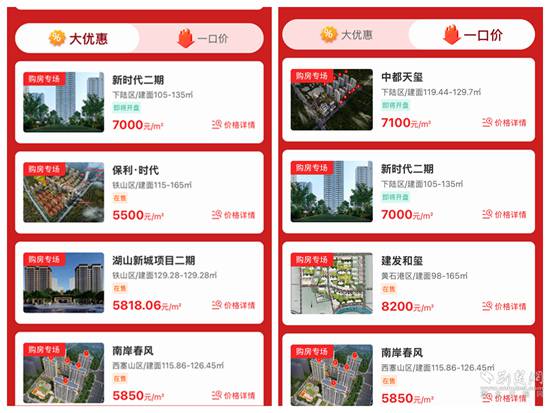 線上,該市在東楚優(yōu)房APP上,開辟“‘宜居黃石’春節(jié)返鄉(xiāng)安居”購房專版,各房地產(chǎn)開發(fā)項目按照自愿原則拿出房源,下設(shè)“一口價”和“大優(yōu)惠”2個專欄?!耙豢趦r”專欄集中展示特價房源;“大優(yōu)惠”專欄集中展示特價房外的其它優(yōu)惠房源。