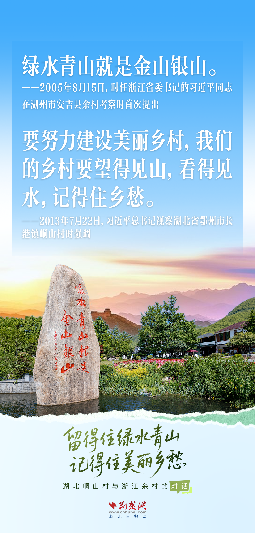 今天,荊楚網(wǎng)(湖北日報(bào)網(wǎng))推出創(chuàng)意海報(bào)《留得住綠水青山,記得住美麗鄉(xiāng)愁——湖北峒山村與浙江余村的對話》,展示中國鄉(xiāng)村的美麗畫卷。