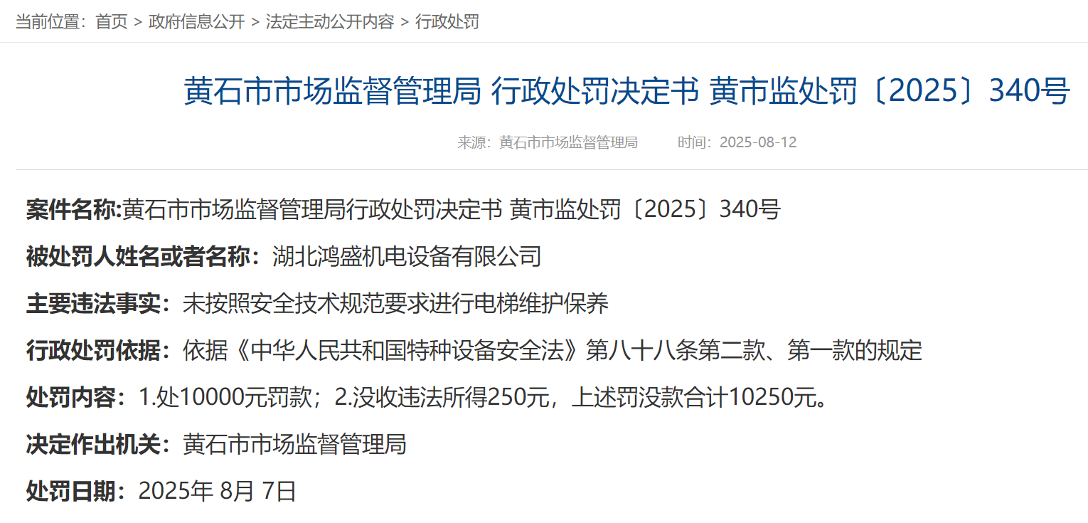 荊楚網(湖北日報網)訊(記者呂鑒蕾)8月12日,黃石市市場監(jiān)督管理局官網連發(fā)三條處罰公告,三家電梯維保公司被處罰。