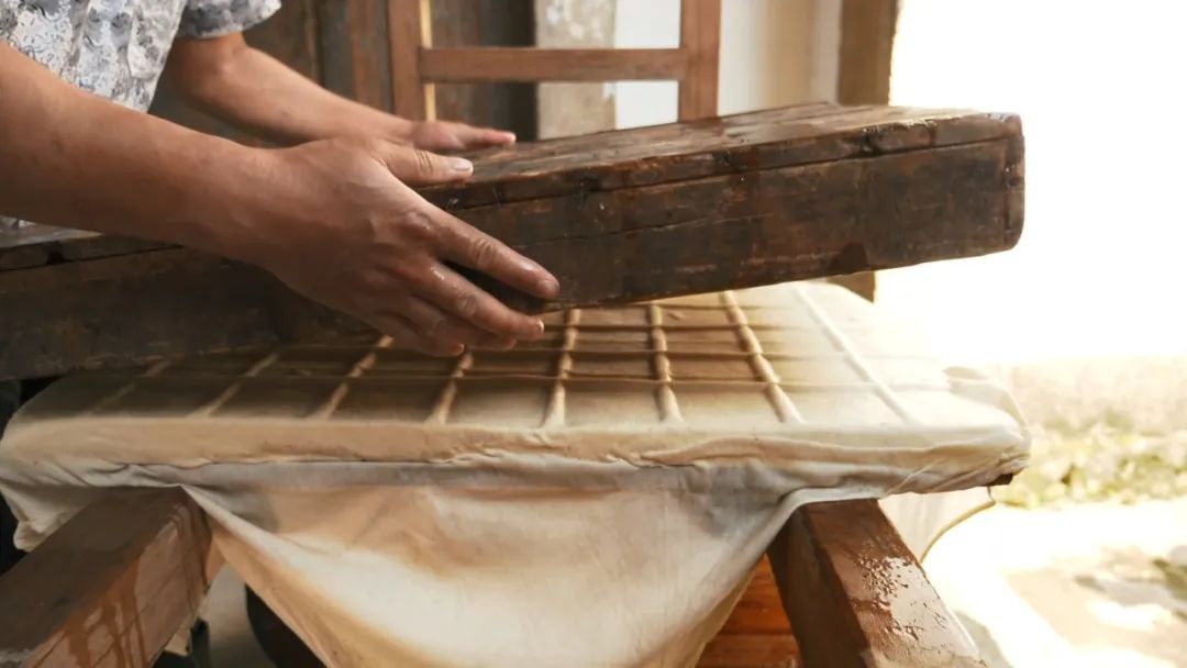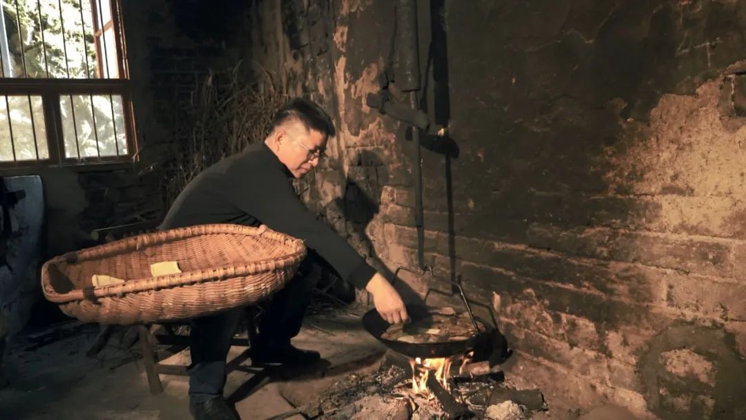 過濾后的生豆?jié){在廚房里燒煮直到沸騰。燒開的豆?jié){裝缸后再被抬到堂屋,加入熟石膏,靜置一段時間就能生成豆腐腦。最后就是上架壓制豆腐干子了,這些其實都就是傳統(tǒng)豆腐的做法。