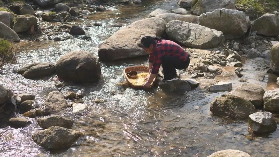 麥?zhǔn)懈勺拥闹谱鲝霓r(nóng)家婦人篩選和浸泡黃豆開始,數(shù)小時后,浸泡好的黃豆被撈起,在溪流中淘洗,其景可以入畫。