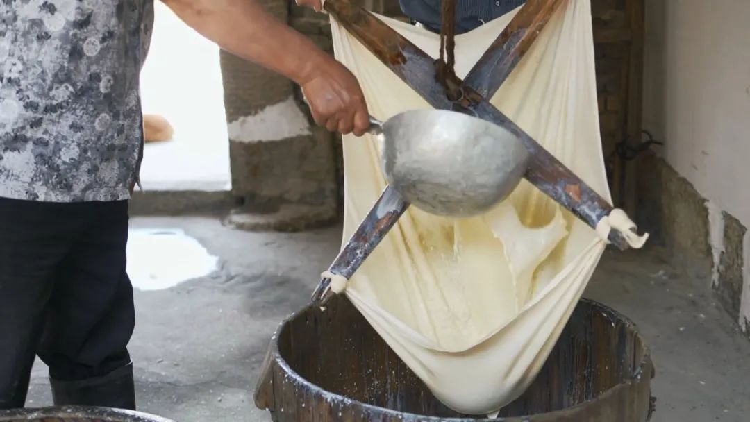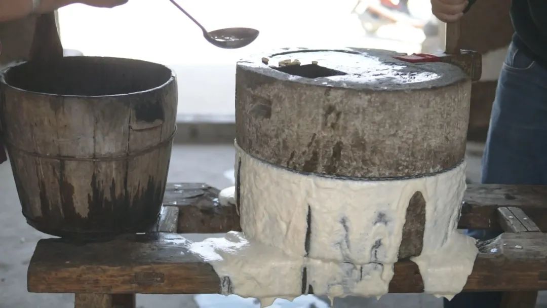 接下來是在石磨中將黃豆磨成漿,磨漿完畢,加水搖漿過濾。這一切都需要慢慢手工操作。