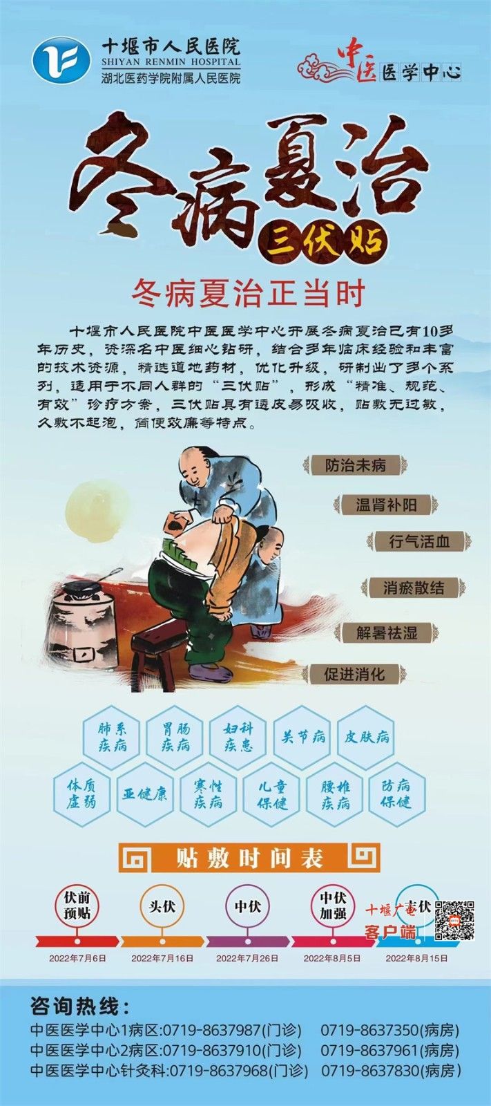 陳峰主任特別提醒:“三伏”穴位貼敷4次為一個療程,一般需連續(xù)貼敷3年至5年。每次貼敷時長2小時為宜,皮膚敏感者及兒童根據(jù)皮膚耐受程度應(yīng)縮短貼敷時間,有發(fā)熱、皮膚潰破、體質(zhì)特別虛弱及患有糖尿病及瘢痕體質(zhì)人群幾類疾病人群,不適宜貼敷三伏貼,同時貼敷三伏貼,應(yīng)在醫(yī)師指導(dǎo)下進(jìn)行貼敷,貼敷過程中,飲食要注意清淡,避免受風(fēng)受涼。