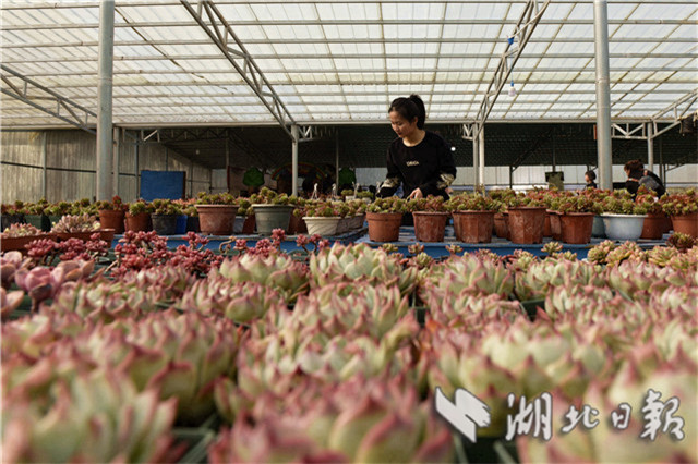 據(jù)了解,該大棚是當(dāng)?shù)乩杳簟⒍澎o、黎姣等5名創(chuàng)業(yè)女青年返鄉(xiāng)創(chuàng)辦的。2016年初,她們共同投資100萬元返鄉(xiāng)創(chuàng)辦青葉多肉植物種植專業(yè)合作社,種植面積30畝,近千個品種,借助“互聯(lián)網(wǎng)+”平臺,把多肉植物產(chǎn)品放到網(wǎng)上銷售,年產(chǎn)銷多肉植物30多萬株。社里還帶動附近10多個村近百名建檔立卡貧困農(nóng)戶發(fā)展花卉種植,成為當(dāng)?shù)剞r(nóng)民脫貧致富新路徑,助力鄉(xiāng)村振興。(視界網(wǎng)劉建平攝)