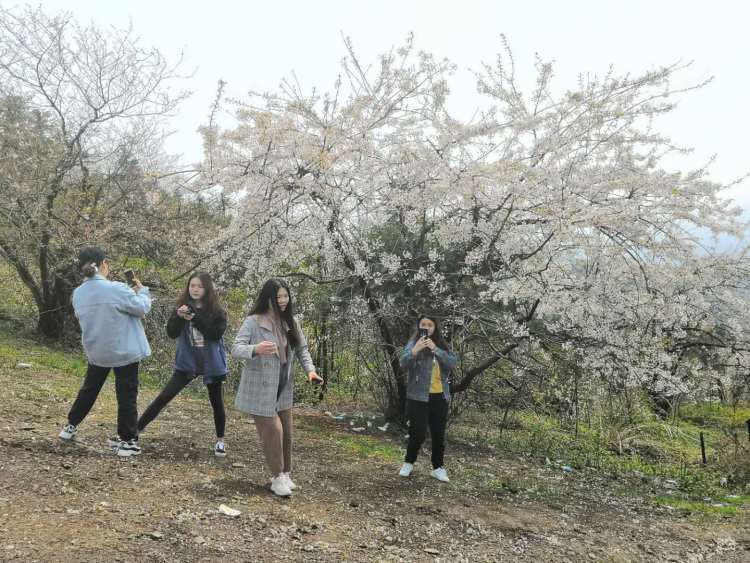 來自湖北大學藝術(shù)學院、中南民族大學美術(shù)學院、湖北美術(shù)學院等高校的師生一行登上大幕山山頂,欣賞遍地野櫻花,俯瞰綿綿山谷,大家對這里的風景贊不絕口,紛紛拍照留念。