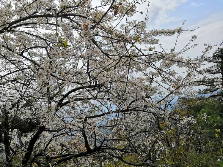 登上山頂,漫山遍野的櫻花開放在樹叢中,大幕的櫻花長得特別的素雅,游客看了心中便升起一股憐愛之情。