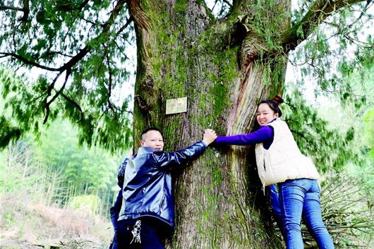 越往山里走,森林越茂密,古樹也越來多。在該村三組的一座老宅后,記者看到一片古樹群。最先映入眼簾的是一棵國家一級(jí)柏樹,上面布滿黑褐色紋理,樹干得幾人合圍。不遠(yuǎn)處,還有國家二級(jí)杉榔、二級(jí)柏樹等,整個(gè)山坡,就被大大小小幾十棵大樹遮蔽,其中被掛牌保護(hù)的就有8棵?!拔覀兇逵?1個(gè)自然村灣,每個(gè)灣子都有這樣的原始老林,而且很多都已被掛牌保護(hù),這是村里最大的財(cái)富?!贝逯淌烂髡f。他還給記者講了個(gè)故事,有一年,一家知名公司的人看上這里的樹,他們?cè)敢獬鰞r(jià)三萬元,買走其中一棵,但村民們毫不心動(dòng),當(dāng)場(chǎng)就給拒絕了!