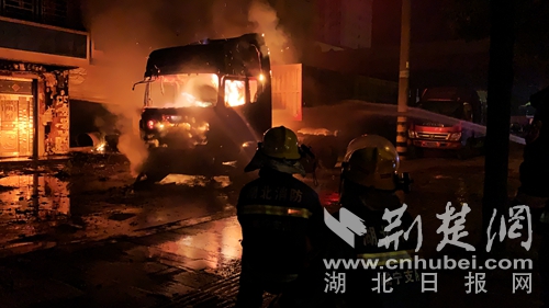 圖為消防指戰(zhàn)員撲滅貨車火災(zāi)現(xiàn)場。 肖幫治攝