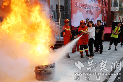 圖為宣傳員手把手傳授滅火器撲滅火災(zāi)現(xiàn)場(chǎng)。 官易洲攝