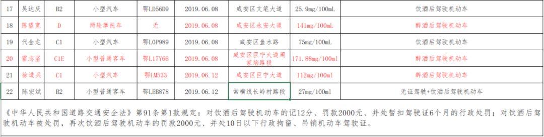 咸安公安分局交警大隊對酒駕醉駕持續(xù)保持高壓嚴(yán)管“零容忍”態(tài)勢,同時對近半個月(5月29日——6月13日)以來的酒駕醉駕駕駛?cè)诉M(jìn)行實名曝光。