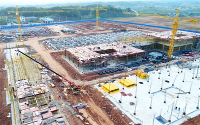 11日,通山縣南林橋雙創(chuàng)(扶貧)產業(yè)園一期建設工地一片繁忙。