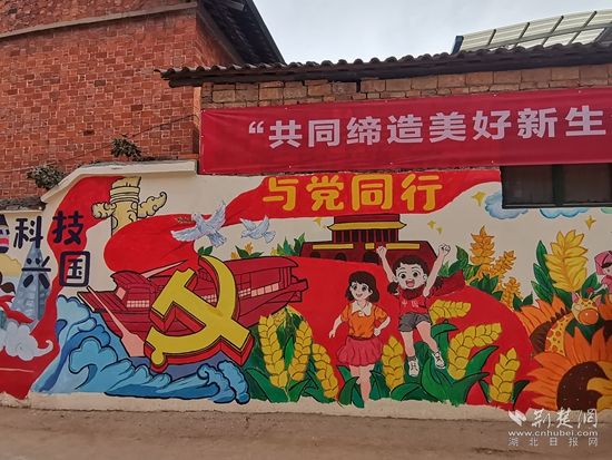 這面墻體上繪制了沐浴黨恩、運動強國、生態(tài)文明、科技興國、與黨同行、向黨向未來六大主題,其中既有充滿活力、朝氣和正能量的向日葵、麥穗、綠樹等植物,又有熊貓、猴子、兔子、獅子等可愛的動物。