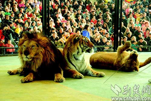 圖為:虎年最受追捧的當屬武漢動物園的“小虎隊”,表演場次較平時增加一倍。 記者劉茜通訊員何志華攝
