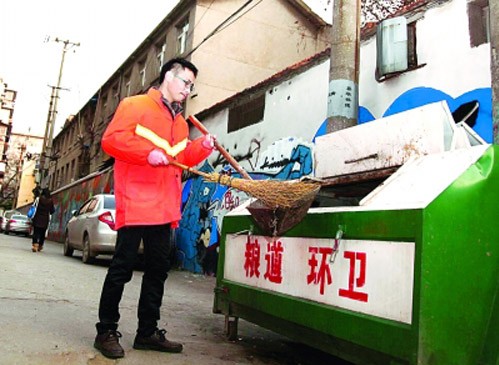 戴著黑框眼鏡、一臉書生氣的劉普林今年上大二,從2010年來武漢上大學后,他一直利用課余時間幫媽媽打掃近400米的責任路面。