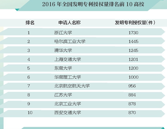 2016年全國(guó)發(fā)明專利授權(quán)量排名前10高校