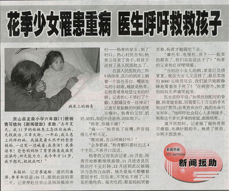 京山縣一對(duì)先后患上急性白血病的少女,妹妹已于一年前不幸夭折,姐姐楊青在死亡線上苦苦掙扎。父母為治療姐妹倆的病,花光了所有積蓄,仍不能湊夠移植骨髓所需的幾十萬(wàn)元手術(shù)和治療費(fèi)用,已經(jīng)陷入絕望。但是,才14歲的楊青不肯向悲慘的命運(yùn)妥協(xié),她寫信給報(bào)社:“我不想死,我要讀書,救救我吧!”